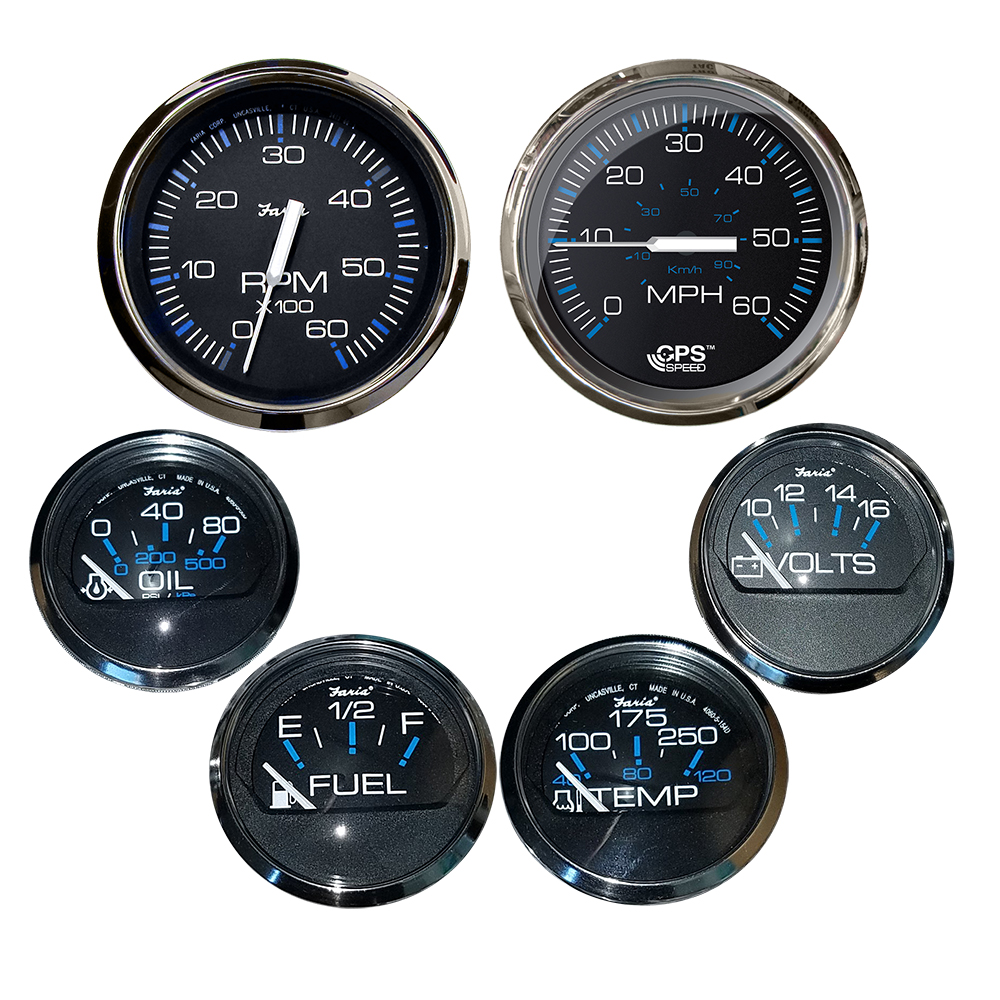 Chesapeake Black w/Stainless Steel Bezel Boxed Set of 6 - Speed, Tach, Fuel Level, Voltmeter, Water Temperature & Oil PSI - Inboard Motors