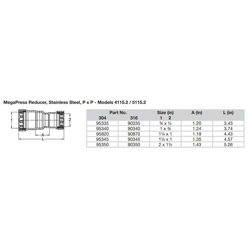 MegaPress 1" x 3/4" Stainless Steel 304 Reducer - Double Press Connection - Smart Connect Technology