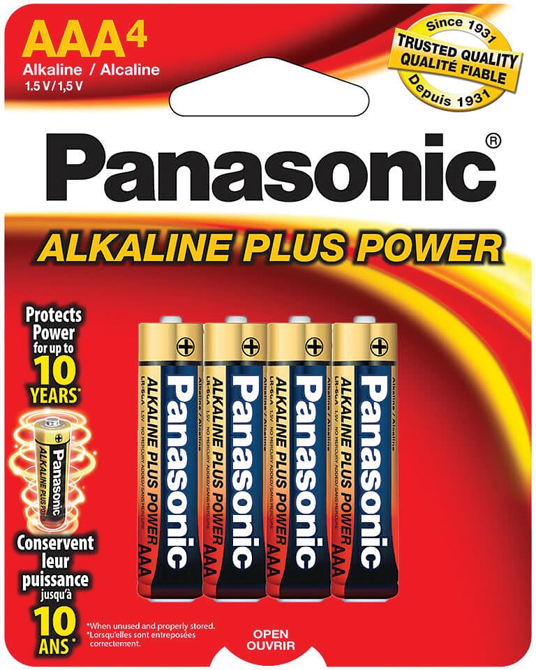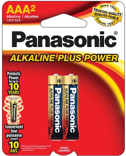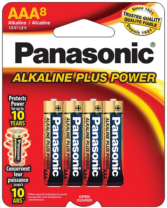 Panasonic Alkaline Plus Power batteries are great for everyday household use. These battery cells are formulated to provide long lasting power for a wide variety of devices. Alkaline Plus Power AA and AAA batteries can be stored up to 10 years. New electrolyte and alloy components combined with new production techniques provide improved levels of leak protection. This technology is especially important when batteries are subjected to an over-discharge during use or long periods of storage.