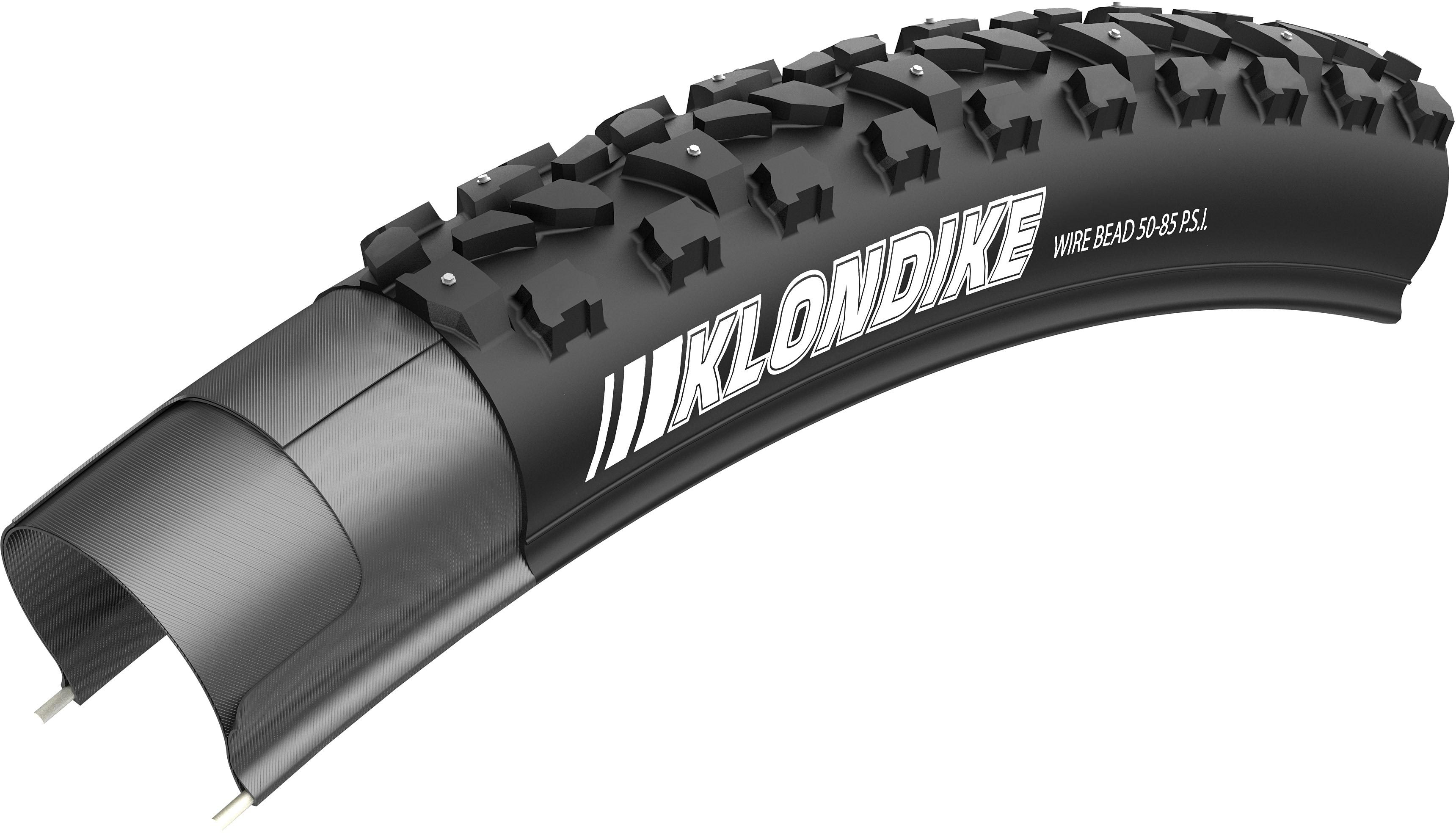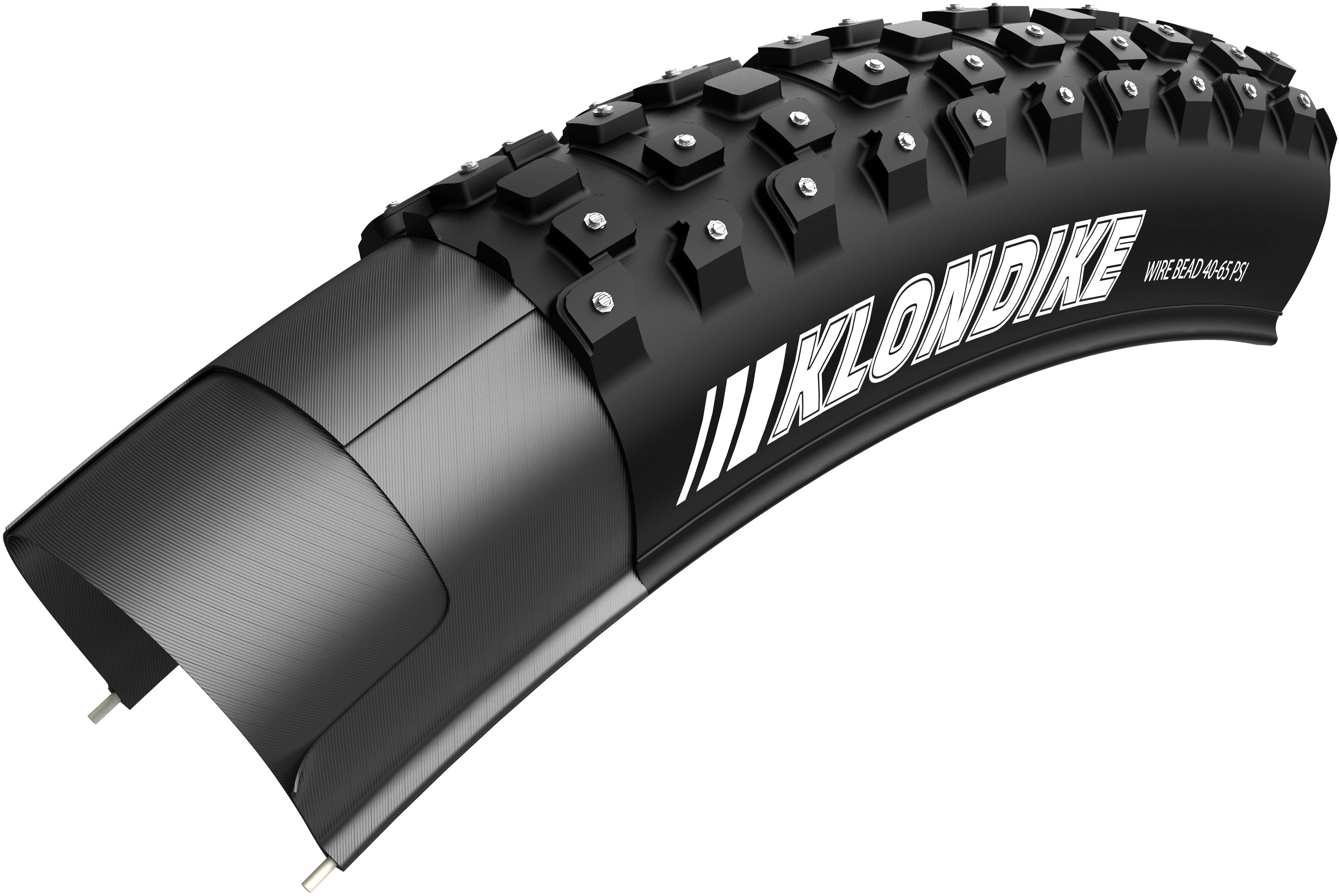 The Klondike tires are designed for pedal jockeys who can't get enough riding time in fair weather. Studded knobs in tread patterns designed for rolling smooth on slick roads or digging in for icy corners on your favorite single-track. Wire bead, some stud loss is to be expected.