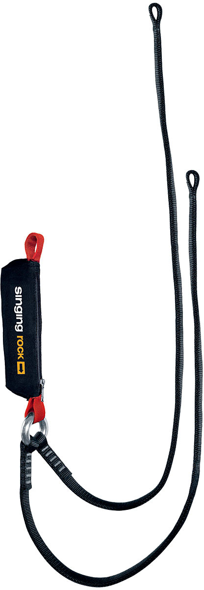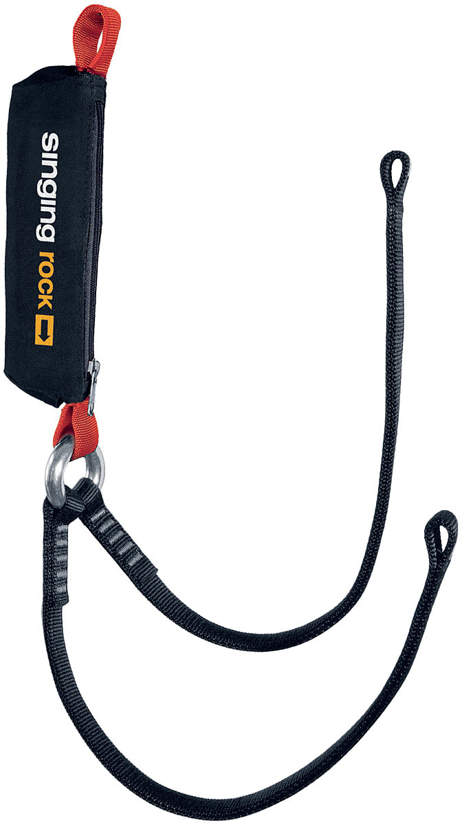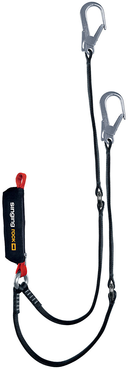 A new tear-apart energy absorber with "I" lanyard or "V" lanyard options. Strength bearing webbing is covered with extra layer of tubular webbing for durability. The shock absorber is covered by a sheath that can be opened for inspection and for drying in case it gets wet. Webbing lanyards attach to aluminum ring. Ring can be used to shorten the webbing lanyard length if needed. Length of completely ripped out fall absorber 140 cm.