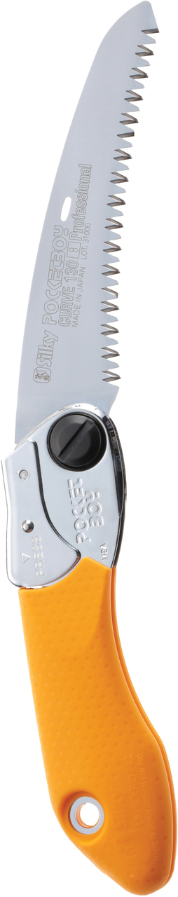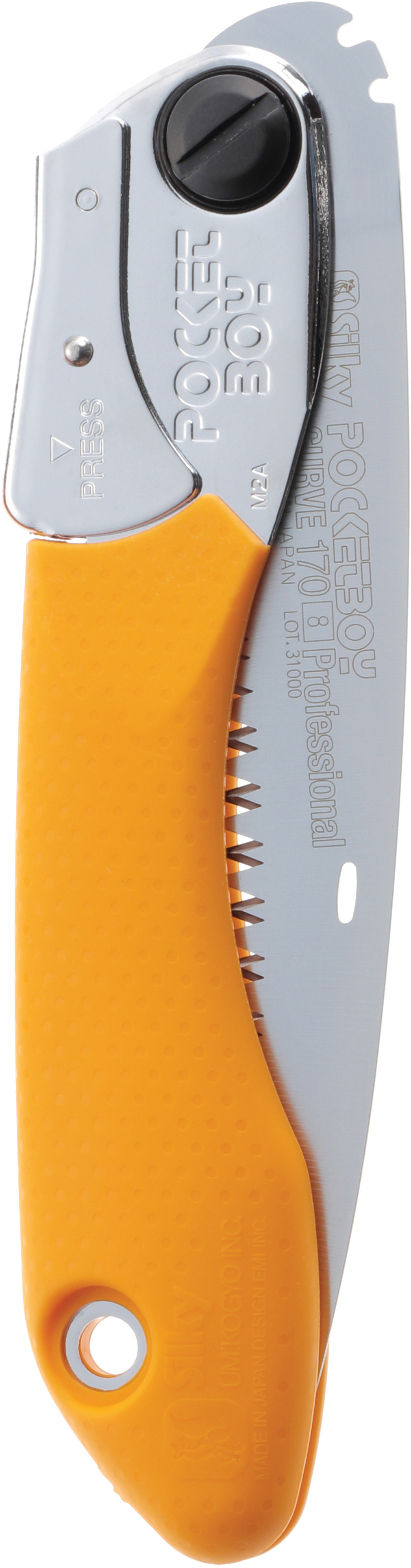 The Silky Pocketboy Curve is a compact folding saw that will take up very little room in a pocket or backpack. It features a rust-resistant, hard chrome-plated, taper-ground blade with an impulse-hardened non-set tooth design for greater cutting efficiency. The blade locks securely into one of two open positions, in line with the handle and flush cutting. Comes with a clear plastic flip-lock carrying case with belt clip.