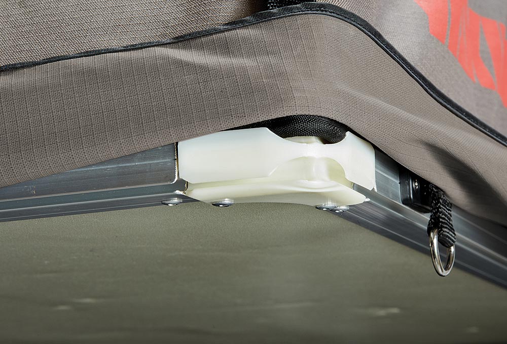 The SkyRise HD is the hub of the ultimate mobile base camp. This latest version of our best-selling rooftop tent features many upgrades and refinements that add up to heavy duty improvements. First, we created a better living environment. The geometry has been revised to deliver more usable space, and expanded windows, doors, and skylights provide grander views and better ventilation. Then we made it more rugged. The thicker 600D Ripstop Poly fabric and an added layer of waterproof PU coating covers the entire tent body to provide 4-season weather protection, and a burlier floor material ups the tent’s durability. Floor-mounted d-rings and guy points make it easier to hang gear and guy out the tent for a secure pitch in windy conditions, and a new ladder design makes it easier to adjust for various vehicle and ground heights. The ladder also has an auto close feature that makes it easy to close up.