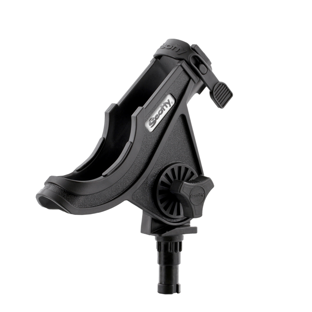 A slot in the front of the rod holder allows for a spinning reel to be securely held in position. The rod holder design has a side-mounted flange, which leaves the bottom open. This allows for the rod holder to accommodate trigger grips. Pistol grip rod butts easily clear the sides of the rod holder for quick rod retrieval. Rod can be secured in a holder with a soft latching strap that snaps over the top.