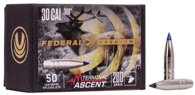 Product Description FEDERAL .308 CALIBER 200GR TERMINAL ASCENT COMP BULLET 50RD Other Details Brand: Federal Reloading Diameter: .308" CA Prop 65: Yes Available Drop Ship Delivery Options: economy|next_day_air|second_day_air|ground Allocated Item?: No Rounds: 50 Grain: 200 gr Reloading Caliber: 30 Cal Lead Free: No Bullet Type: PT Brand Family: Terminal Ascent Bullet Material: Jacketed Lead